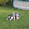 Der Versuch, sie nach ihren Erkundungsausflügen auf eine Decke zu legen, schlug fehl. Ein wahrer PON braucht keine Schlafunterlage!! Den Auslauf haben wir erweitert und es gibt viel Neues zu entdecken. Unser Besucheransturm hält ununterbrochen an. Auch für die zweite Hündin haben wir nun neue Pflegeeltern gefunden.