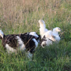 Sie wachsen und wachsen... Ihre Interaktionen nehmen rapide zu. Während fast alle schon fertig mit dem Zahnen sind, hat unser Nachzügler erst damit angefangen. Mia nimmt sich jetzt extrem zurück. Leider ist sie nicht wirklich in der Lage, den Welpen zu erklären, dass die Milchbar so allmählich geschlossen wird. Deshalb besteht ihr Spiel mit Welpen darin, in Eile von einem Punkt zum anderen zu flitzen. Sowie sie stehen bleibt, hängen 6 gierige Mäulchen an den Zitzen. Papa Edison hat seinen Nachwuchs nun auch schon bestaunt. Er war total cool und gelassen.